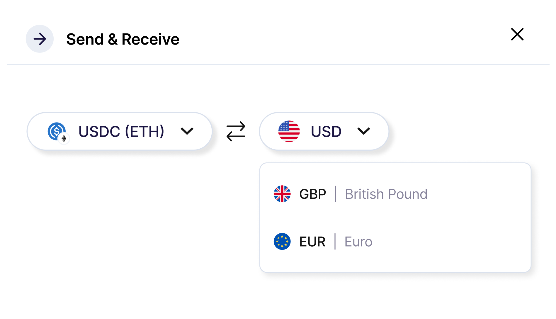 Pay-in and pay-out using a wide network of local and international payment rails, including SWIFT, SEPA Instant, stablecoins and more.