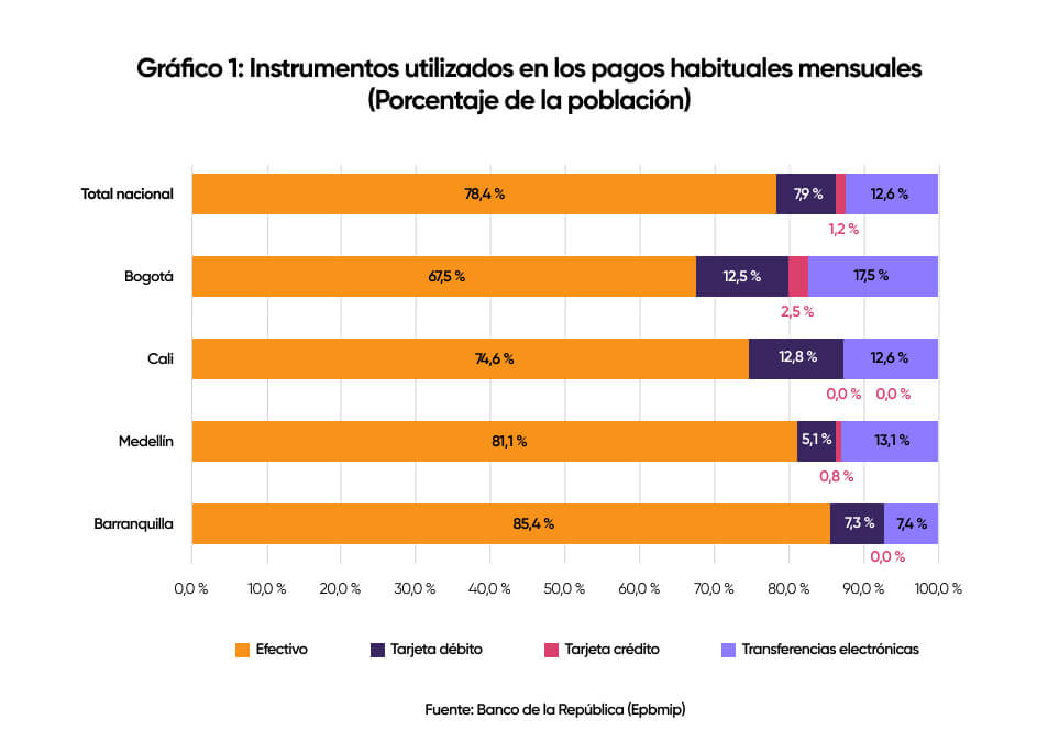Mirando específicamente las ciudades, Bogotá se destaca por un menor uso del efectivo y una mayor adopción de transferencias electrónicas. En contraste, en Cali, Medellín y Barranquilla, el uso del efectivo es considerablemente mayor, mientras que las tarjetas débito y las transferencias electrónicas se utilizan menos.