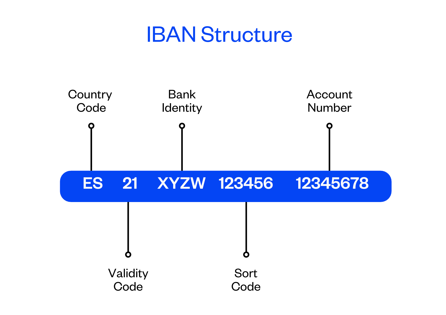 O formato de um IBAN é um código alfanumérico contínuo de até 34 caracteres, precedido por um código de país de duas letras e dois dígitos de controle. Veja a seguir um exemplo de estrutura do IBAN: